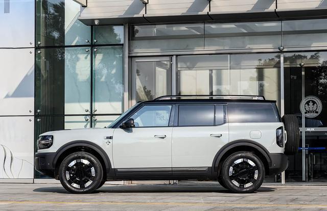 再来看车身侧面部分,车身侧面以经典的“方盒子”造型呈现,笔直的肩线测度打算与D柱小窗的抬起,延续了硬派越野车的典型元素。5025mm×1960mm×1815mm的车身尺寸与2950mm轴距,在同级中属于尺度中型SUV边界,但通过避讳式门把手与18英寸越野魄力轮毂的组合,既优化了0.35Cd的超风阻统统,又兼顾了实用性与好意思不雅性。况兼宽大轮眉与短前后悬测度打算,进一步强化了硬派越野的视觉张力。